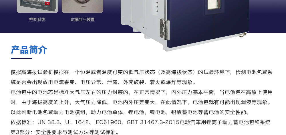 用途:模擬高海拔試驗(yàn)機(jī)模擬在一個(gè)恒溫或者溫度可變的低氣壓狀態(tài)(及高海拔狀態(tài))的試驗(yàn)環(huán)境下,檢測電池包或系統(tǒng)是否會(huì)出現(xiàn)放電電流睿變、電壓異常、泄露、外殼破裂、著火或爆炸等