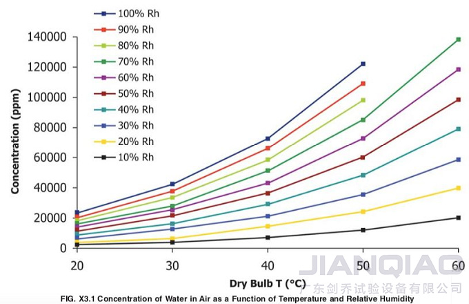 附錄X3中,表3.1是恒定水蒸氣含量下,相對(duì)濕度與溫度的關(guān)系。而圖3.1是水蒸氣含量、溫度、相對(duì)濕度三者之間的關(guān)系。在考慮了相對(duì)濕度對(duì)產(chǎn)品材料的損傷性后,大家可以針對(duì)一定溫度建立適宜的相對(duì)濕度范圍,進(jìn)而調(diào)整試驗(yàn)條件。