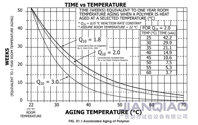 大家仔細(xì)分析上述兩個(gè)公式可以發(fā)現(xiàn),決定加速老化時(shí)間的關(guān)鍵因素是加速老化溫度,根據(jù)ASTM F1980-16附錄X1.1,能夠明確無(wú)菌屏障系統(tǒng)在選定溫度下的熱老化相當(dāng)于1年的室溫老化的時(shí)間。例如,若確定Q10為2,加速老化溫度選用50℃,則加速老化時(shí)間為7.5周。特別要注意的是,大多數(shù)醫(yī)用聚合物建議的溫度上限是60℃。